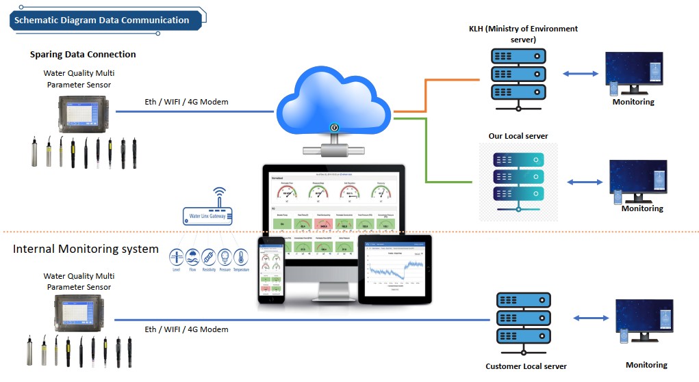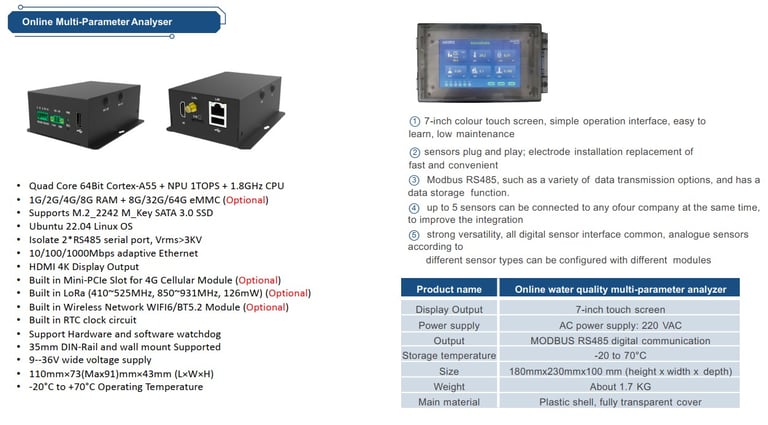 This system also supports other sensors, such as: Turbidity, TDS, EC, DO, COD, BOD, ORP, Cl-, F⁻, H₂S, S²⁻, Mn, Cr, SAR, NH₄⁺-N.