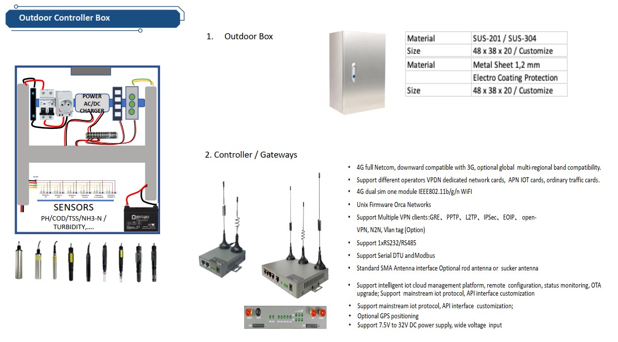 OEMS integrates multi-parameter sensors to continuously monitor critical water quality parameters such as pH, dissolved oxygen (DO), electrical conductivity (EC), total dissolved solids (TDS), turbidity, temperature and the other sensors.